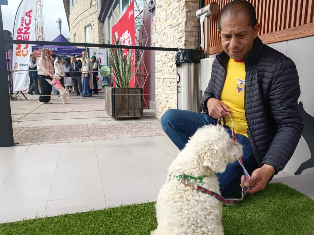 Javier Déleg, junto con su perrito llamado Sebastián, llegó ayer desde la parroquia rural de Paccha al Aeropuerto Mariscal La Mar, tras enterarse en redes sociales de la inauguración de un espacio confortable destinado exclusivamente al descanso y aseo de mascotas, conocido como Pet Relief.