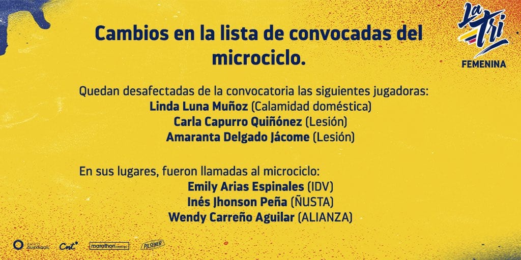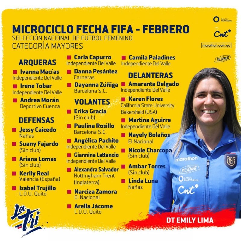 En la nómina de 26 jugadoras, Lima realizó tres cambios a última hora y convocó a la delantera cuencana Wendy Carreño, quien fue parte del Deportivo Cuenca los dos últimos años y ahora está como refuerzo del Alianza FC que participa en la Liga Amateur de Futbol Femenino Serie A.