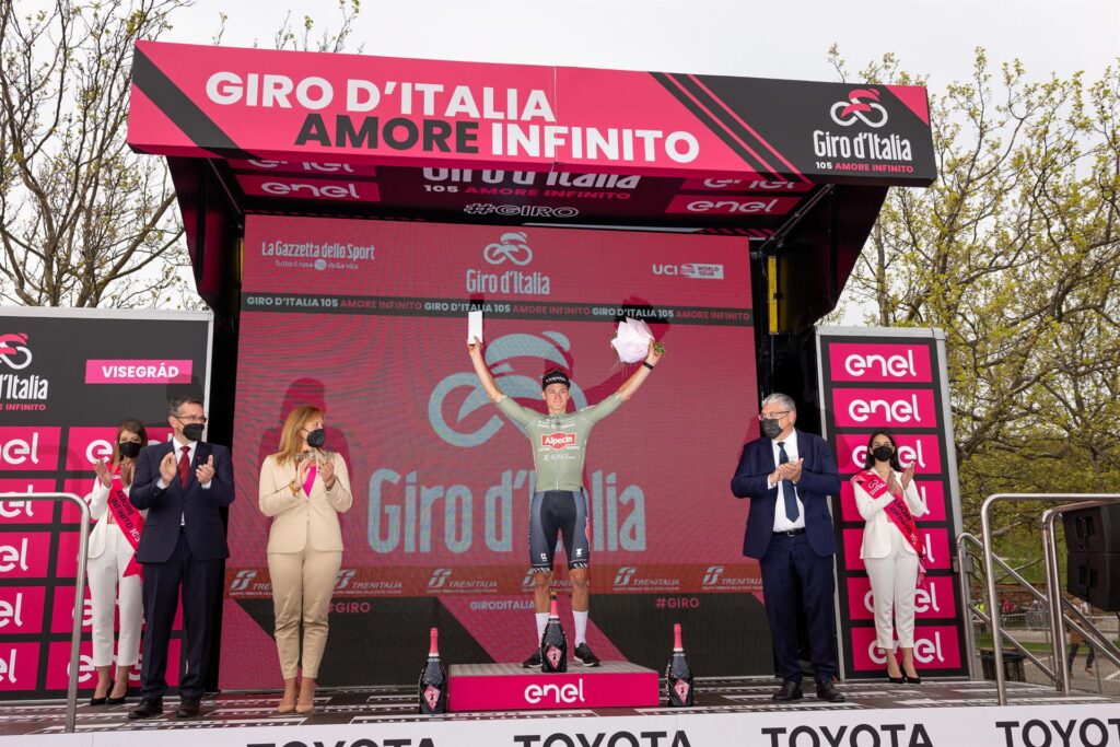 Van der Poel (Kapellen, 27 años), debutó en el Tour de Francia en 2021 y logró el sueño de enfundarse el maillot amarillo con triunfo de etapa. Esta vez, en su debut en el Giro tenía la ilusión de verse con la maglia rosa. Y lo consiguió imponiendo su ley en la primera etapa en tierras húngaras.