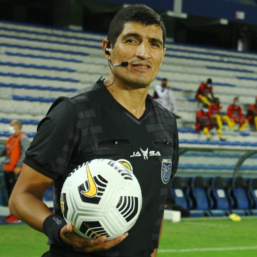 El árbitro Diego Lara tuvo que correr para salvar su vida este domingo siete de agosto de 2022 en el estadio Olímpico Atahualpa.