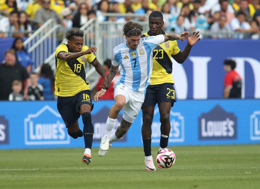 Desde los primeros minutos, Argentina tomó el control, generó pero no pudo. Ángel Di María, por la banda derecha causó daño a la Tricolor, lugar donde Piero Hincapié de lateral sufrió mucho. En en medio campo, Rodrigo De Paul, fue el que generaba, luchaba y creaba.