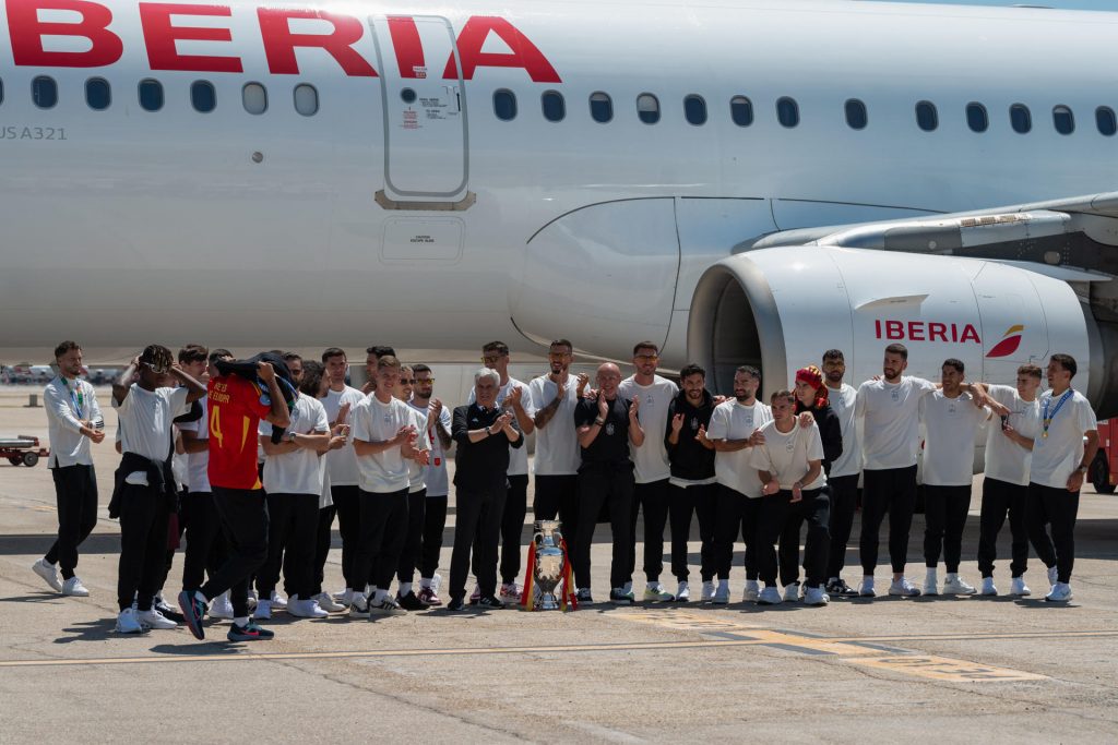 El avión, con los integrantes de la selección española de fútbol campeona de la Eurocopa 2024, con el trofeo conquistado, ha aterrizado procedentes de Alemania en una de las pistas del Aeropuerto Adolfo Suárez Madrid-Barajas de Madrid.
