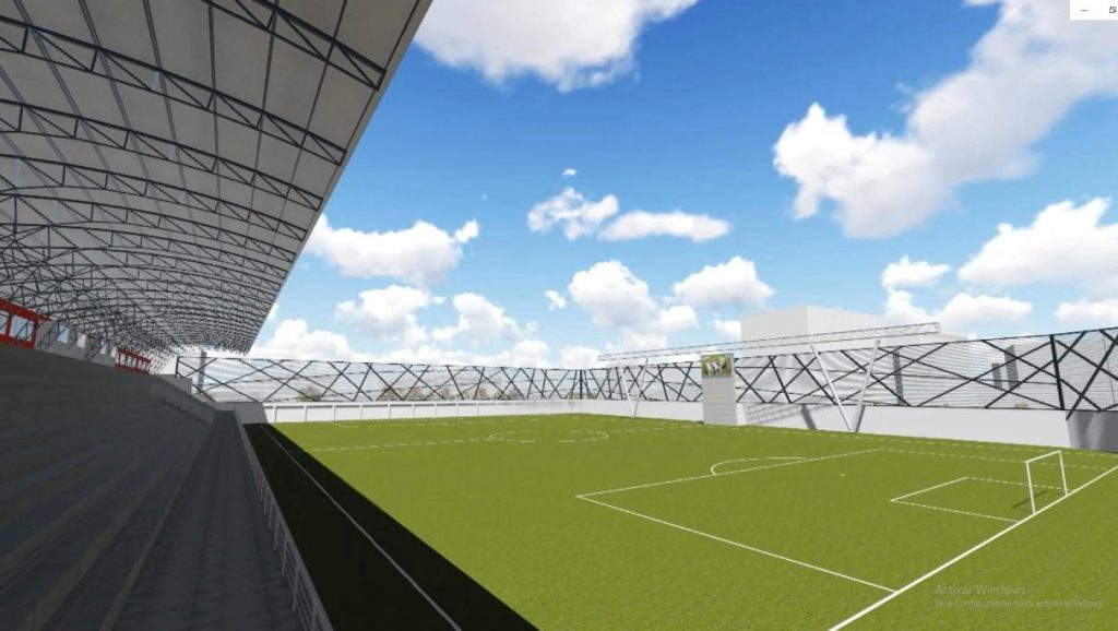 El proyecto contempla una cancha de fútbol reglamentaria de césped natural, apta para partidos oficiales, con medidas homologadas y un sistema de iluminación profesional.