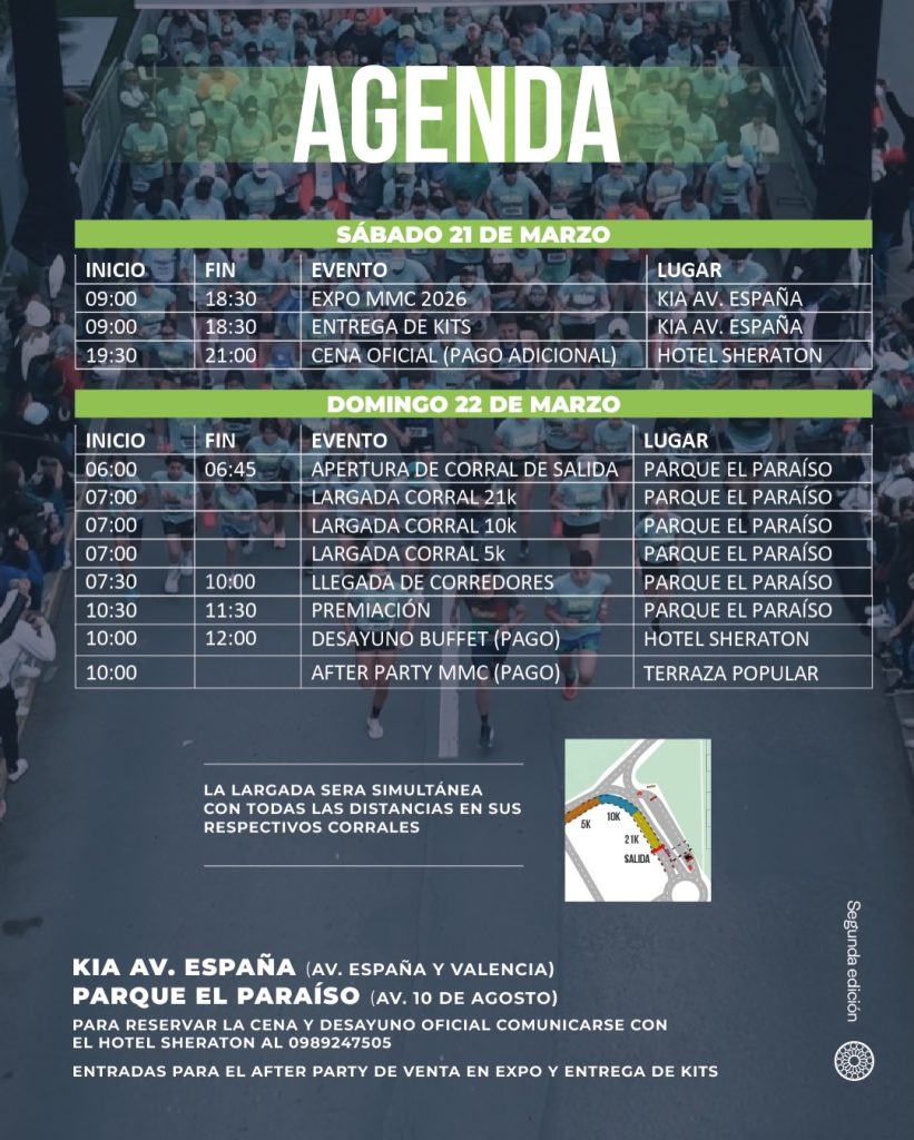 La actividad principal se vivirá el domingo 22 de marzo en el Parque El Paraíso. Desde las 06:00 se abrirán los corrales de salida. A las 07:00 se dará la largada simultánea para todas las distancias: 21K, 10K y 5K. Además, la llegada de los primeros corredores está prevista desde las 07:30, en una jornada que culminará con la premiación a las 10:30.