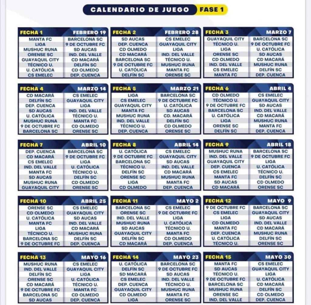 Según el calendario que desveló el dos de febrero la Liga Profesional de Fútbol del Ecuador, los morlacos visitarán a los eléctricos el 19 de febrero. Su primer rival en condición de local será Guayaquil City.