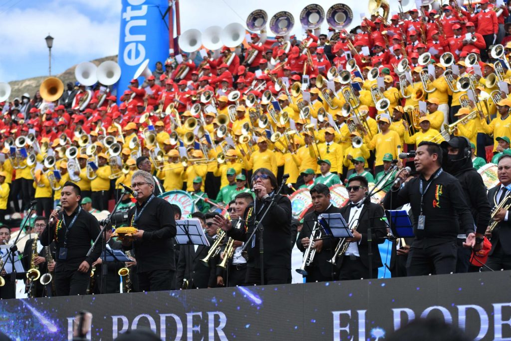 Los músicos se instalaron en una gran tribuna con atuendos rojo, amarillo y verde, que representan la bandera boliviana, y fusionaron sus notas con la interpretación de varios de los más representativos conjuntos folclóricos del país como Savia Andina, Chila Jatun, Raymi Bolivia y Jatun Raymi.