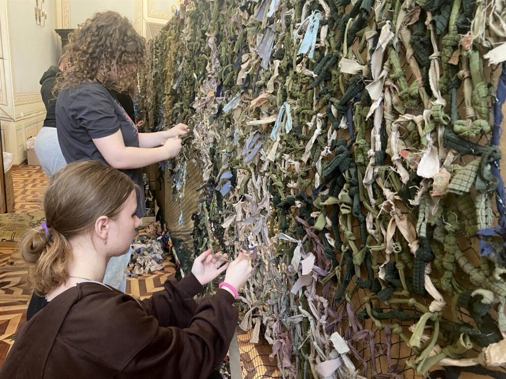 En la planta de abajo, los voluntarios cortan en tiras las telas donadas por los ciudadanos de Leópolis: cortinas, manteles, sábanas, vestidos, pantalones… todo se aprovecha mientras sea en tonos tierra y verdes. Y en la planta superior, rodeados de los grandes títulos de la literatura ucraniana, otro grupo anuda y entrelaza esos jirones de tela en los agujeros de redes de pesca.
