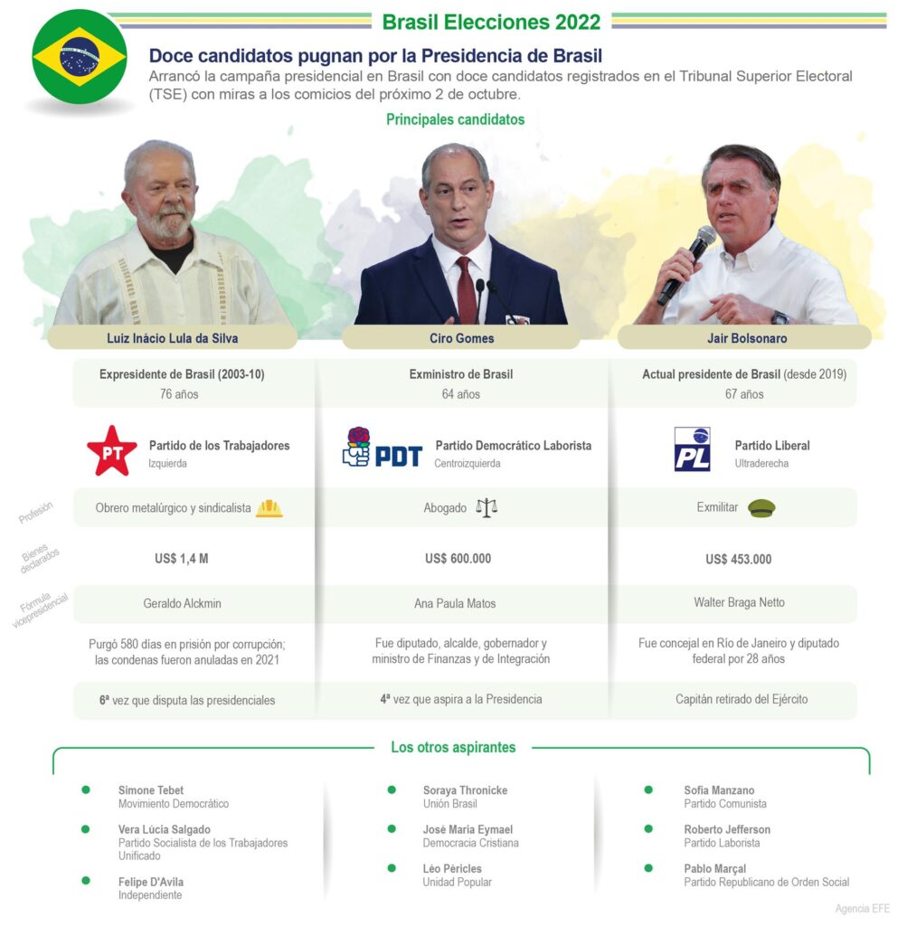 La batalla presidencial, que cuenta con doce aspirantes en total, prácticamente se reduce a Lula y Bolsonaro, que concentran el 80 % de las intenciones de voto, según los sondeos, que también prevén un triunfo holgado del exlíder sindical el próximo 2 de octubre.