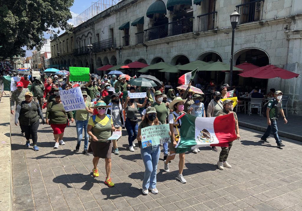 En la ciudad de Oaxaca, sur de México, unas 100 personas participaron en la protesta a la que asistieron amigos y familiares de soldados de la región vestidos con playeras verdes y camisolas militares, la cual ocurrió en las instalaciones de 28 zona militar.