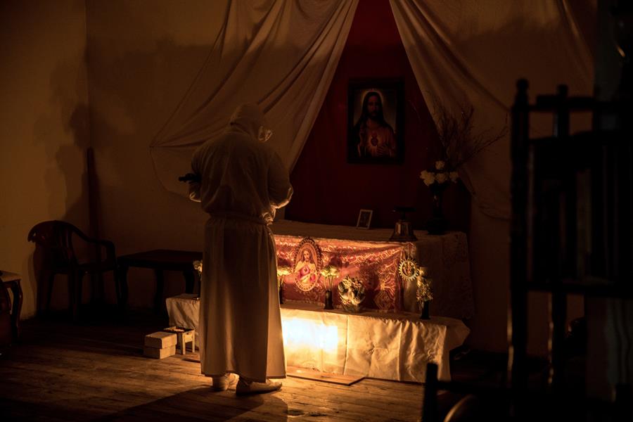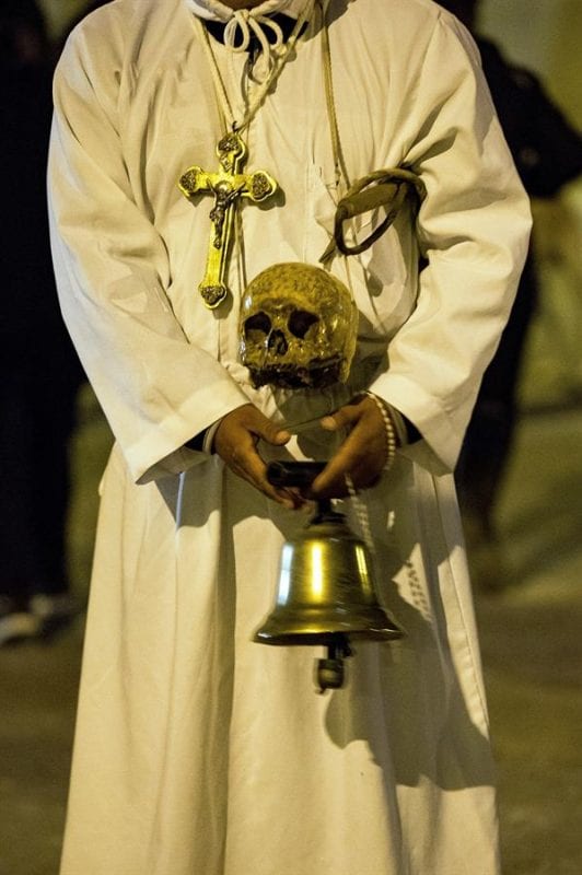 Lara se viste como en la tradición, con una túnica blanca con capucha, un cordón para ceñirla, un gran crucifijo, una campanilla de bronce, una calavera y un rosario para recorrer las calles de la pequeña localidad.