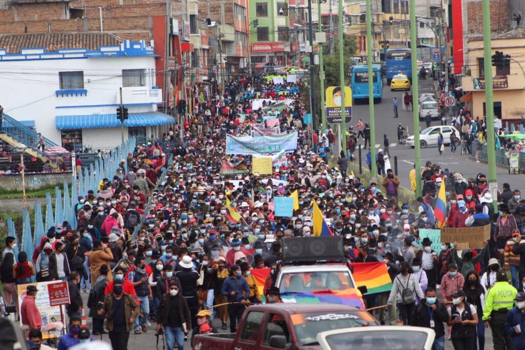 La mayoría de participantes en la manifestación portaban mascarillas y avanzaban con banderas de Ecuador y del movimiento indígena.