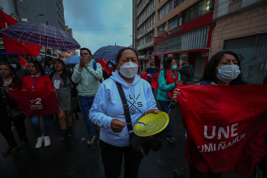 Por segundo día consecutivo hubo una movilización de docentes convocada por la Unión Nacional de Educadores (UNE) en el casco antiguo de Quito, deslucida por la intensa lluvia caída en la capital ecuatoriana instantes antes de la cita para esta concentración.