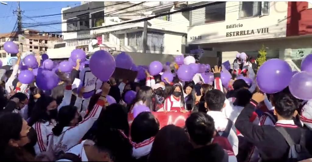 La mañana de este martes 26 de abril de 2022, estudiantes de un colegio de Quito, protestaron en los exteriores del Ministerio de Educación para pedir justicia para una estudiante que denunció que fue violada poe el conductor de la unidad de transporte escolar.