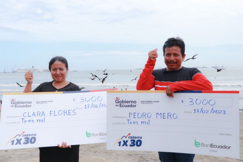 Flores y Mero son parte de los beneficiarios a quienes se les entregó el crédito 1×30 en el sector Playita Mía, en Manta, durante un evento que contó con la presencia de Andrés Arens, viceministro de Acuacultura y Pesca y Mauricio Salem, presidente del directorio de BanEcuador.
