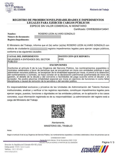 Para el 19 de noviembre del 2025, el impedimento que a Rosero no le permitía ejercer el cargo público, por tener deudas con una institución del Estado, había sido levantado.
