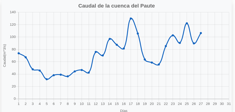Debido a las últimas lluvias, el caudal del río Paute alcanzó, a las 08:00 de este martes 27 de enero, un valor de 106,37 metros cúbicos por segundo (m³/s). Este registro se ubica como el tercero más alto del mes. Anteriormente, el 17 de enero llegó a 129,88 m³/s y el 25 de enero alcanzó los 122,13 m³/s.