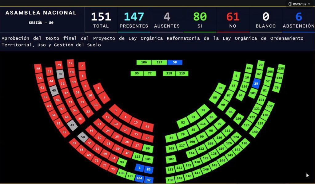 En un segundo intento, el Pleno de la Asamblea Nacional logró aprobar la reforma a la Ley Orgánica de Ordenamiento Territorial, Uso y Gestión del Suelo, la cual se analizó el 24 de marzo del 2026, pero, supuestamente por falta de votos, su votación fue aplazada y el texto volvió a la Comisión de Gobiernos Autónomos, Descentralización, Competencias y Organización Territorial.