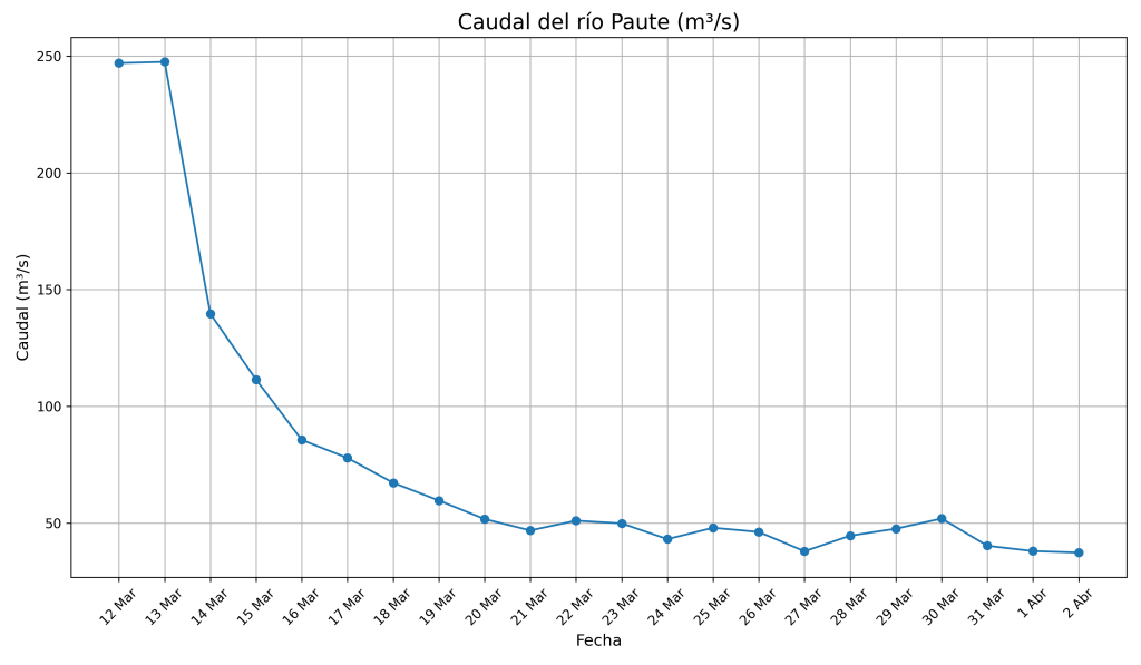 Desde este 13 de marzo de 2026, el caudal del río Paute presenta una disminución constante. Ese día registró un nivel de 247,46 metros cúbicos por segundo (m³/s), el más alto en lo que va del año.