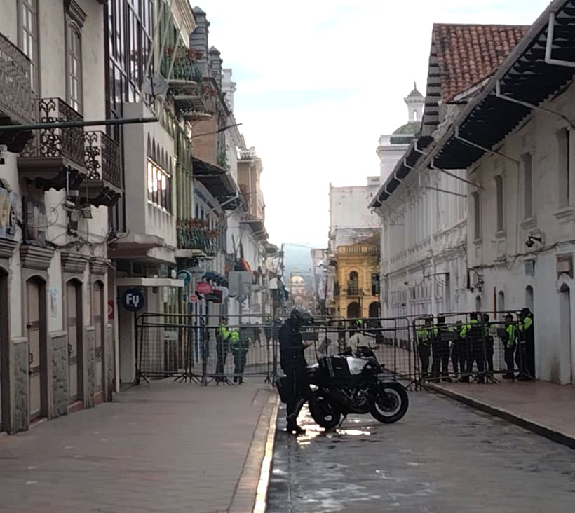 Este 8 de octubre de 2025, los alrededores del Parque Calderón amanecieron vallados por la presencia del presidente Daniel Noboa, quien se encuentra en Cuenca desde ayer. Las intersecciones de la Gran Colombia y Benigno Malo, Presidente Córdova y Benigno Malo, Bolívar y Borrero, Sucre y Padre Aguirre, y