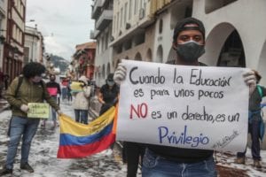 Cuando llegaron al Parque Calderón, los estudiantes se tomaron la calle Bolívar, ahí hicieron una representación simbólica de sus reclamos. No solo el recorte a la educación, también el rechazo a los sonados casos de corrupción que cada día se conocen en el país, recordaron los hechos de octubre.
