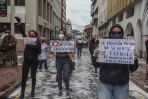 También llegaron docentes y padres de familia. Carmen Sacaquirín es madre de una estudiante de la UNAE. Se unió a la marcha para reclamar por el despido de 37 docentes en días pasadas en esa universidad. “Mi hija se ha quedado de 8 maestros con 2, existe desmotivación en los estudiantes porque no saben a qué atenerse”, contó.
