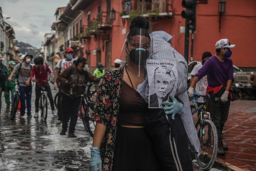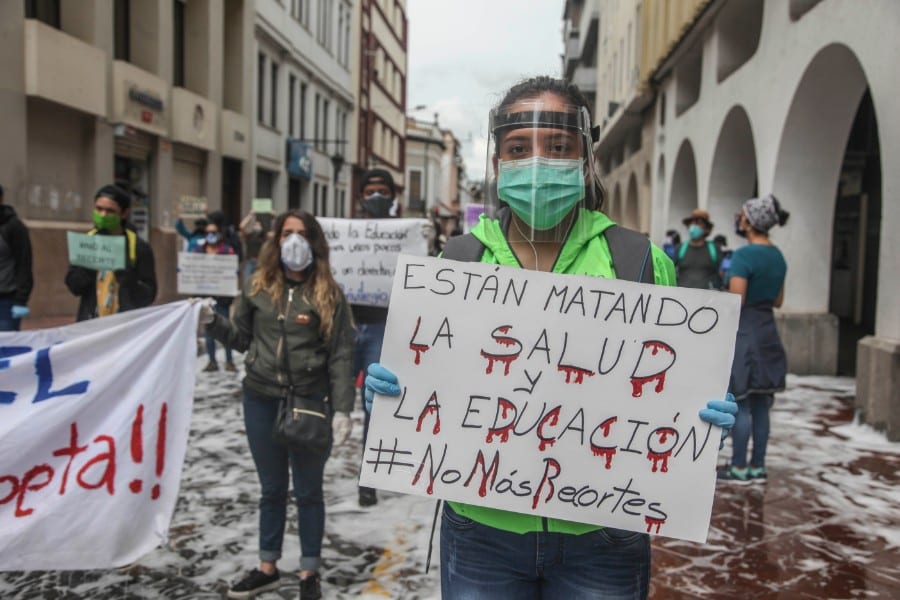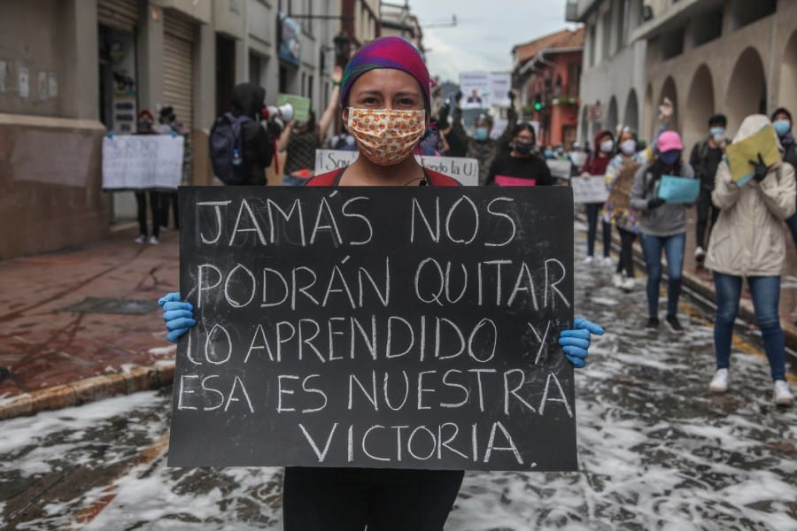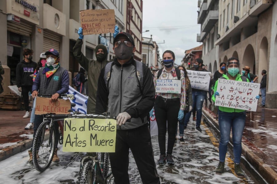 Estudiantes de la Universidad de Cuenca y de la Universidad Nacional de Educación (UNAE) se concentraron la mañana de este miércoles 13 de mayo del 2020 en la avenida Doce de Abril para marchar hacia la Gobernación del Azuay para dejar un manifiesto.
