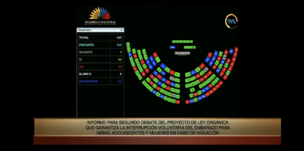 Cerca de las 12:30, la Asamblea retomó la votación del proyecto de ley. Ahora, el informe de mayoría propone un plazo de 12 semanas para interrumpir el embarazo y de 18 semanas para las niñas, adolescentes y mujeres de la ruralidad, pueblos y nacionalidades.