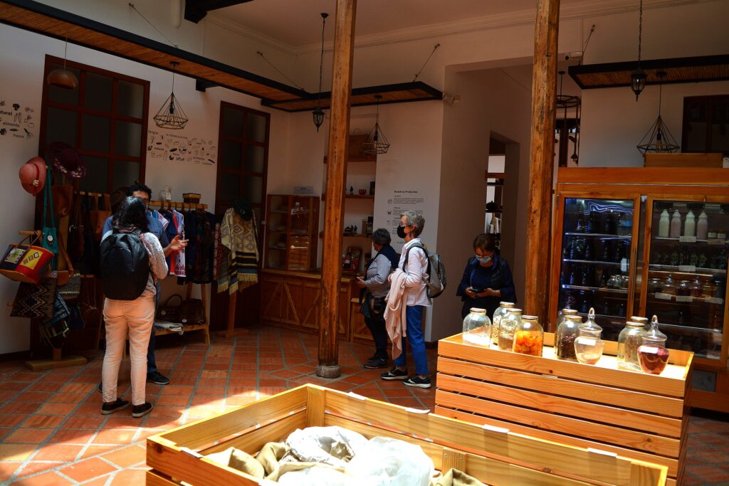 En una edificación patrimonial restaurada funciona un espacio donde la gente puede adquirir productos de elaboración local y a la vez tener un momento de esparcimiento.