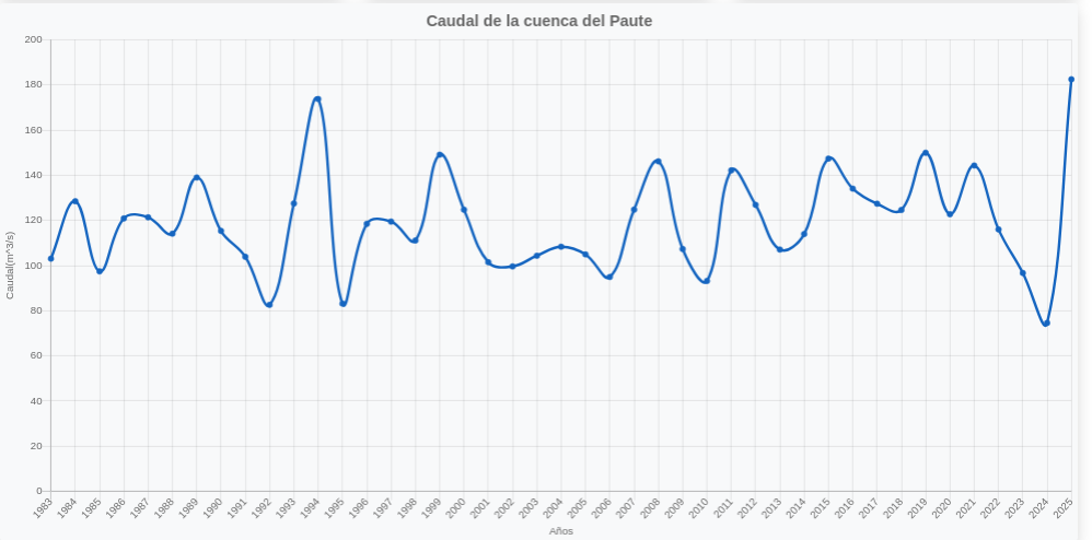 El río Paute registra este año un caudal promedio de 182,45 metros cúbicos por segundo (m³/s), el más alto desde 1983, cuando comenzaron los registros. Esta cifra marca un hito en su comportamiento hídrico.
