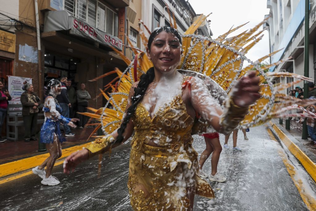 Saúl Coronel, exmilitar e integrante de la banda musical “Estelar”, llega cada año desde Cuenca para participar en los desfiles de Carnaval junto a sus amigos oriundos de Azogues. Saúl, de 64 años, señaló que el Carnaval se vive con agua, espuma y maicena, pero siempre con respeto a los asistentes.