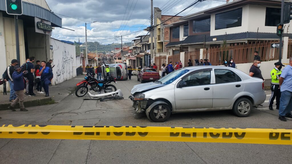 Dos vehículos chocaron en la intersección de las calles Juan Montalvo y Muñoz Vernaza. El percance, que sucedió este jueves 7 de julio de 2022 a las 10:23, fue captado por cámaras de seguridad particular. Los videos revelaron que uno de los conductores no observó la luz roja del semáforo y se produjo el impacto.