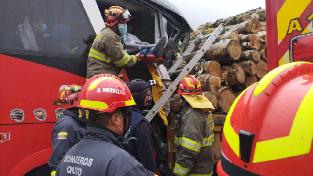 Una persona falleció y otras doce resultaron heridas este lunes, 29 de agosto de 2022, al chocar un autobús con un camión que cargaba troncos, en Quito.