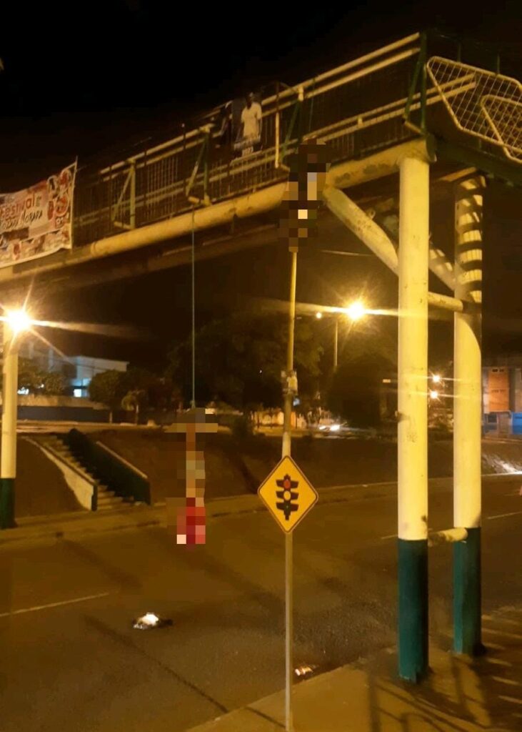La madrugada de este 31 de octubre, los dos cuerpos estaban atados con cuerdas y suspendidos de la estructura del paso peatonal. El espeluznante hecho fue observado por conductores y transeúntes que alrededor de las 02:00 avanzaban por el lugar.