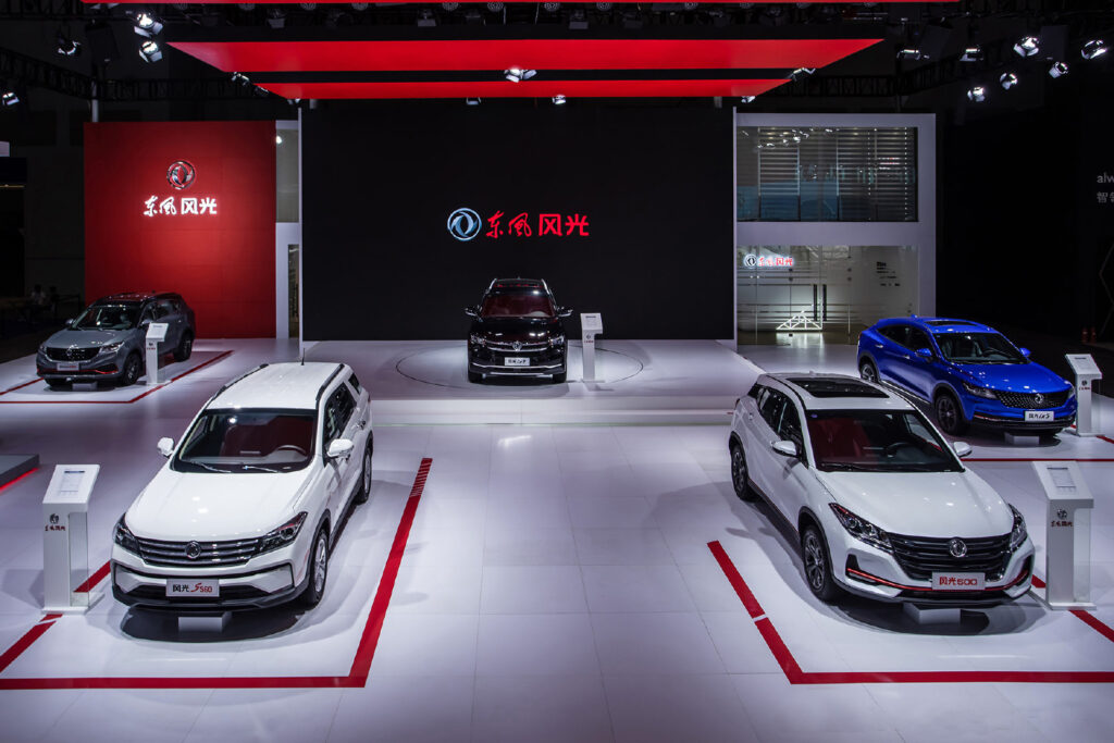 Si no puedes salir a Chongqing en esta semana, te traemos el stand de DFSK directamente a donde te encuentres. (En la plataforma moderna de DFSK están los siguientes vehículos de izquierda a derecha: Glory 580 Star version, Glory 560, Glory IX7, Glory 500 y Glory IX6)