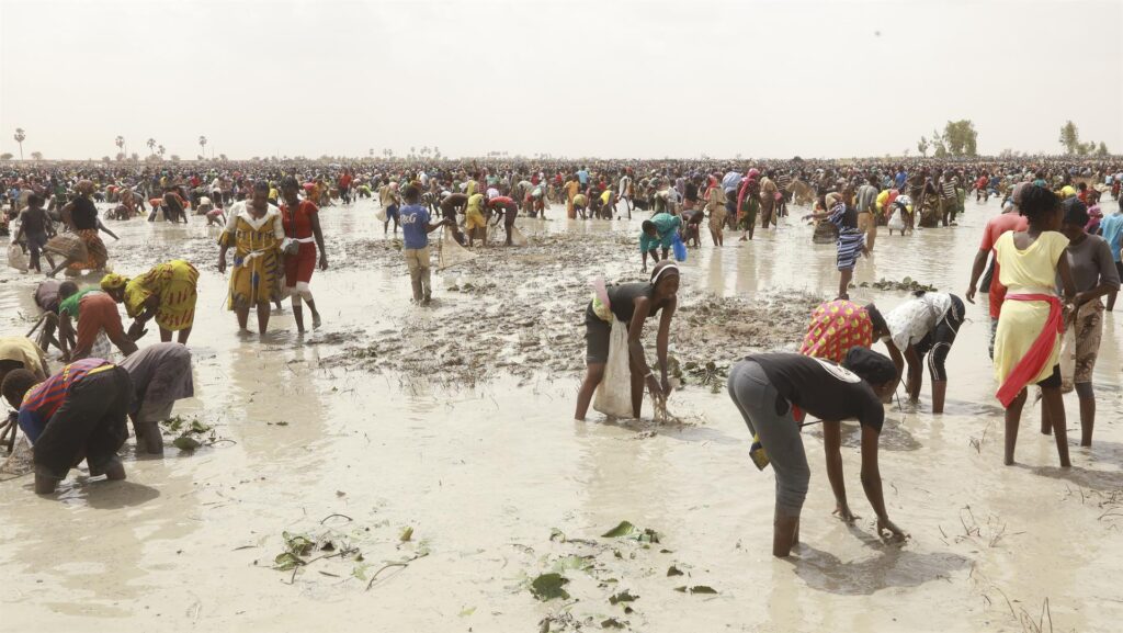 Una vez finalizados los rezos y danzas comienza el rito de pesca colectiva en la laguna de Sanké que dura varias horas. Mujeres, hombres y niños, pescadores aficionados y profesionales, todos se abalanzaron en masas en la laguna para pescar con redes de mallas de diferentes tamaños, finas y gruesas.