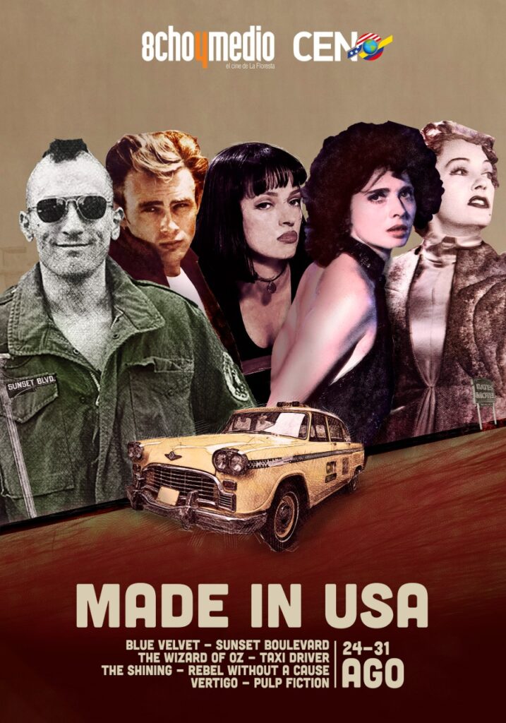 Como parte de su programación cultural en la ciudad de Quito, el Centro Ecuatoriano Norteamericano (CEN) proyectará la primera muestra enfocada en cine norteamericano, denominada “Made in USA, American Films Forever”. Desde el 24 hasta el 31 de agosto, la ciudadanía podrá asistir de manera gratuita a las salas de cine de 8choymedio, ubicadas en Valladolid N24-353 y Vizcaya (barrio La Floresta), para disfrutar de 8 éxitos que han marcado la historia del séptimo arte en Estados Unidos, en su idioma original: Rebelde sin Causa, Taxi Driver, Sunset Boulevard, Blue Velvet, Pulp Fiction, El Resplandor, El Mago de Oz y Vértigo.