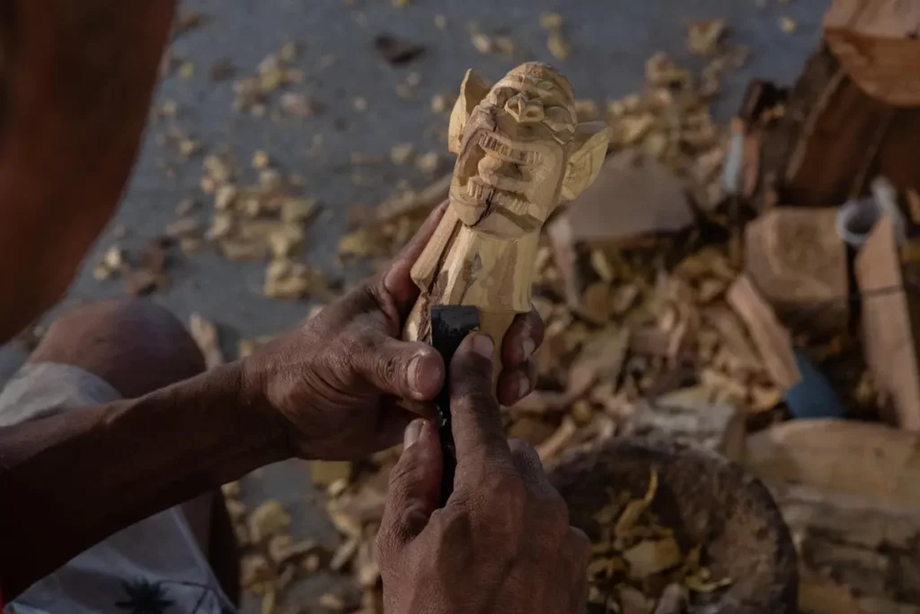 Lesandro Evangelista de Oliveira, conocido como «maestro Sandro», tiene entre sus manos un pequeña escultura de madera desnuda. Es la primera «carranca» tallada por su hijo unos minutos atrás.