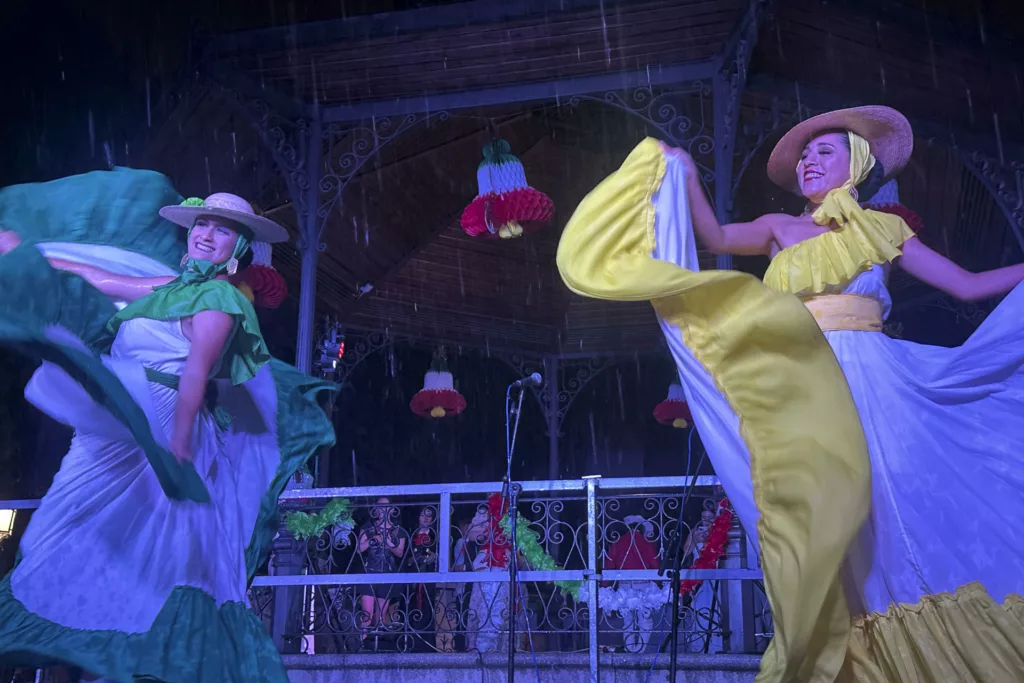 Una danza típica sinaloense abrió la fiesta anoche, pero como dijo en Alejandra, “el dios Tláloc -figura sagrada mexicana de la lluvia- hizo de las suyas” y roció de agua a las tres bailarinas.