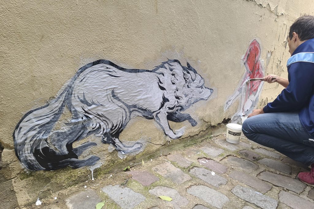 Junto a «Little chaperon rouge», una creadora que prefiere mantener el anonimato, Thomas dibuja el lobo y su compañera Caperucita. Lo hacen en los papeles de cartelería y usan pintura acrílica o tinta china.