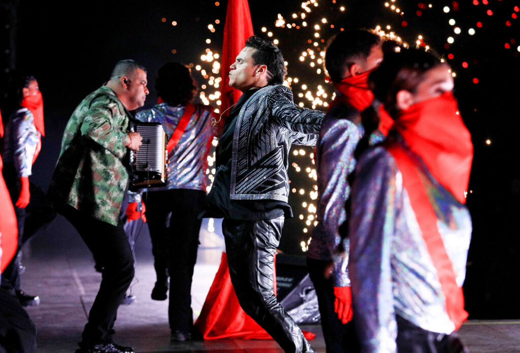 Un espectáculo de drones iluminó el cielo bogotano en la apertura del concierto que comenzó con ‘Bacano’, tema de su último álbum ‘Ta Malo’, precedido por bailarinas vestidas de rojo, el color de la noche.