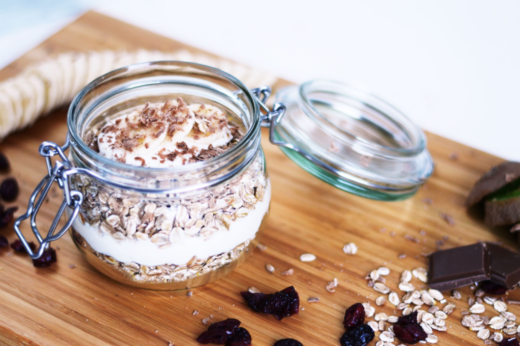 - Parfaits con yogur, avena inflada y frutas frescas como banano o frutillas.