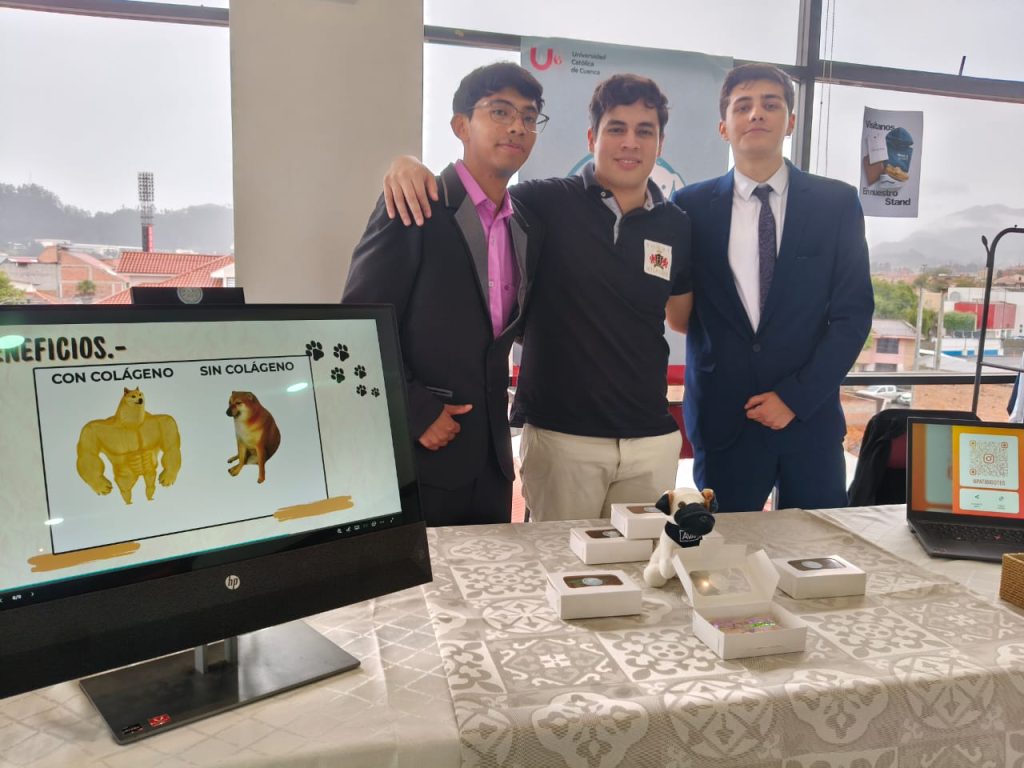 Entre las propuestas estuvieron “Patitas y Bigotes”, un emprendimiento de Juan Chocho, Steven García y Sebastián Díaz, estudiantes de tercer ciclo de Negocios Internacionales, que propone gomitas a base de colágeno para mascotas, un suplemento que ayuda a las articulaciones. “No hay productos similares en el mercado local”, indicó Juan.