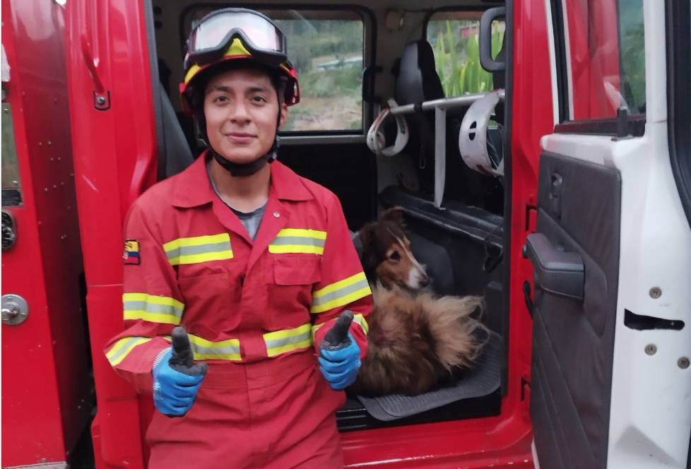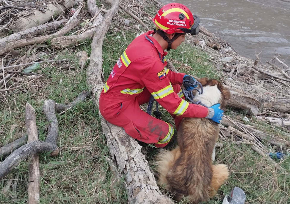 Bomberos de Guachapala rescataron a un perrito que era atacado por gallinazos en una orilla del río.