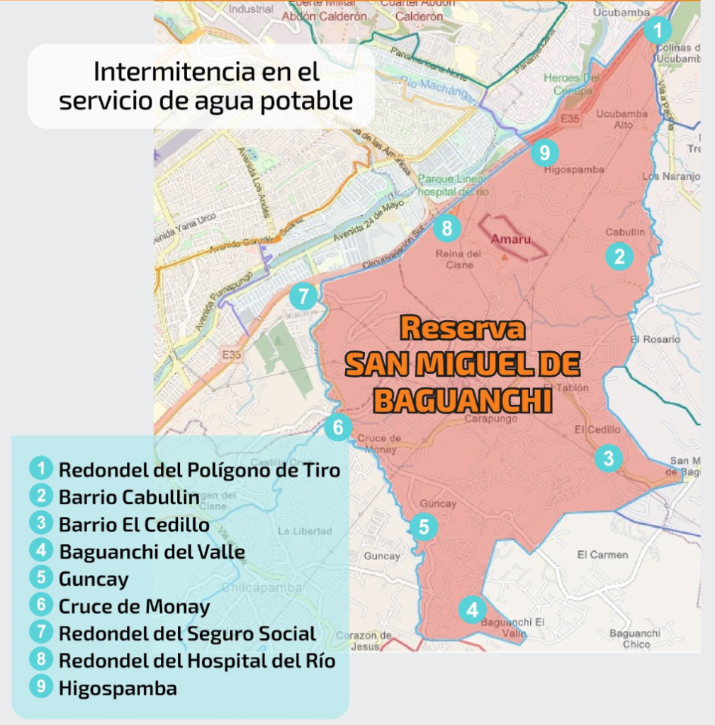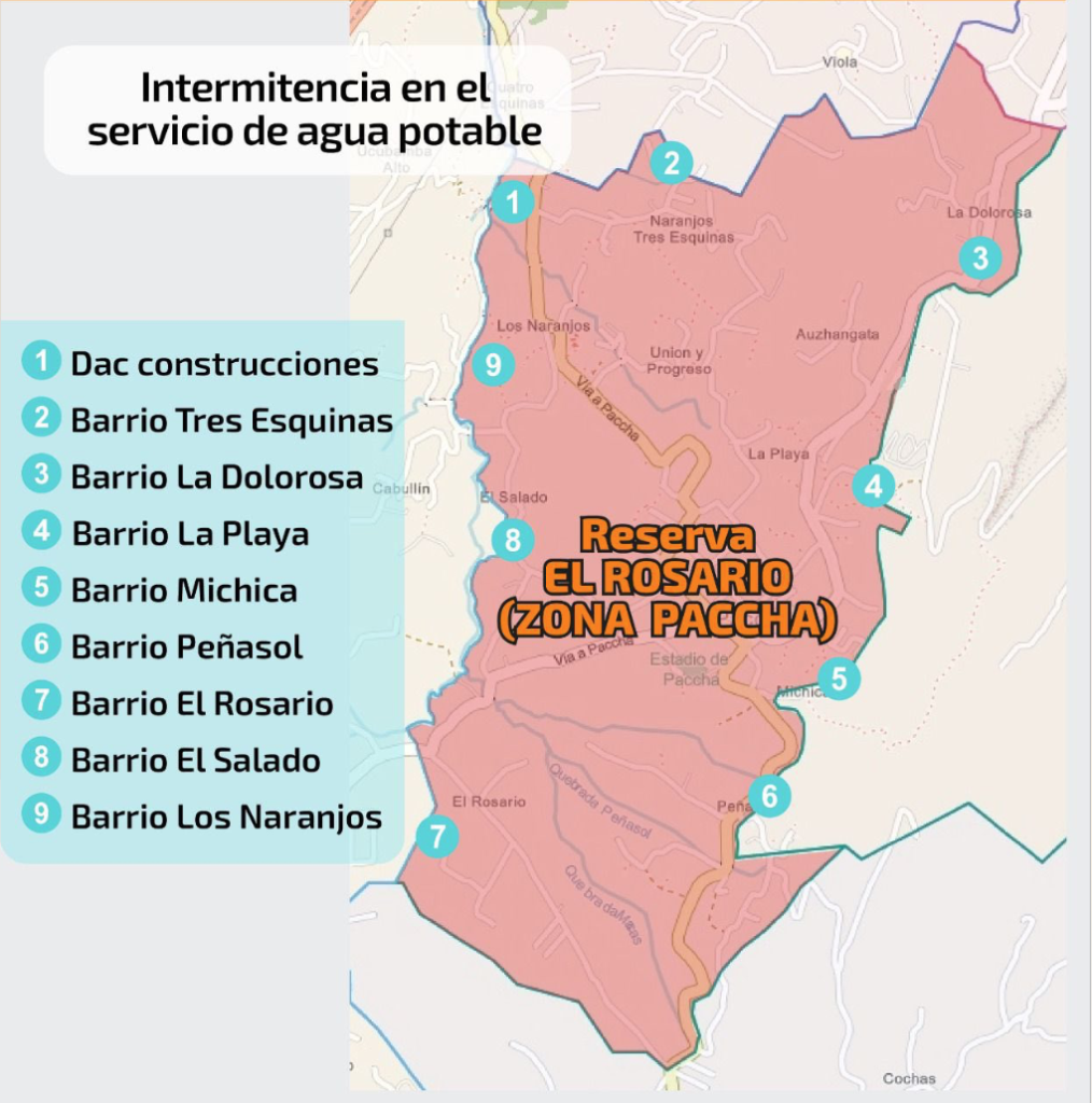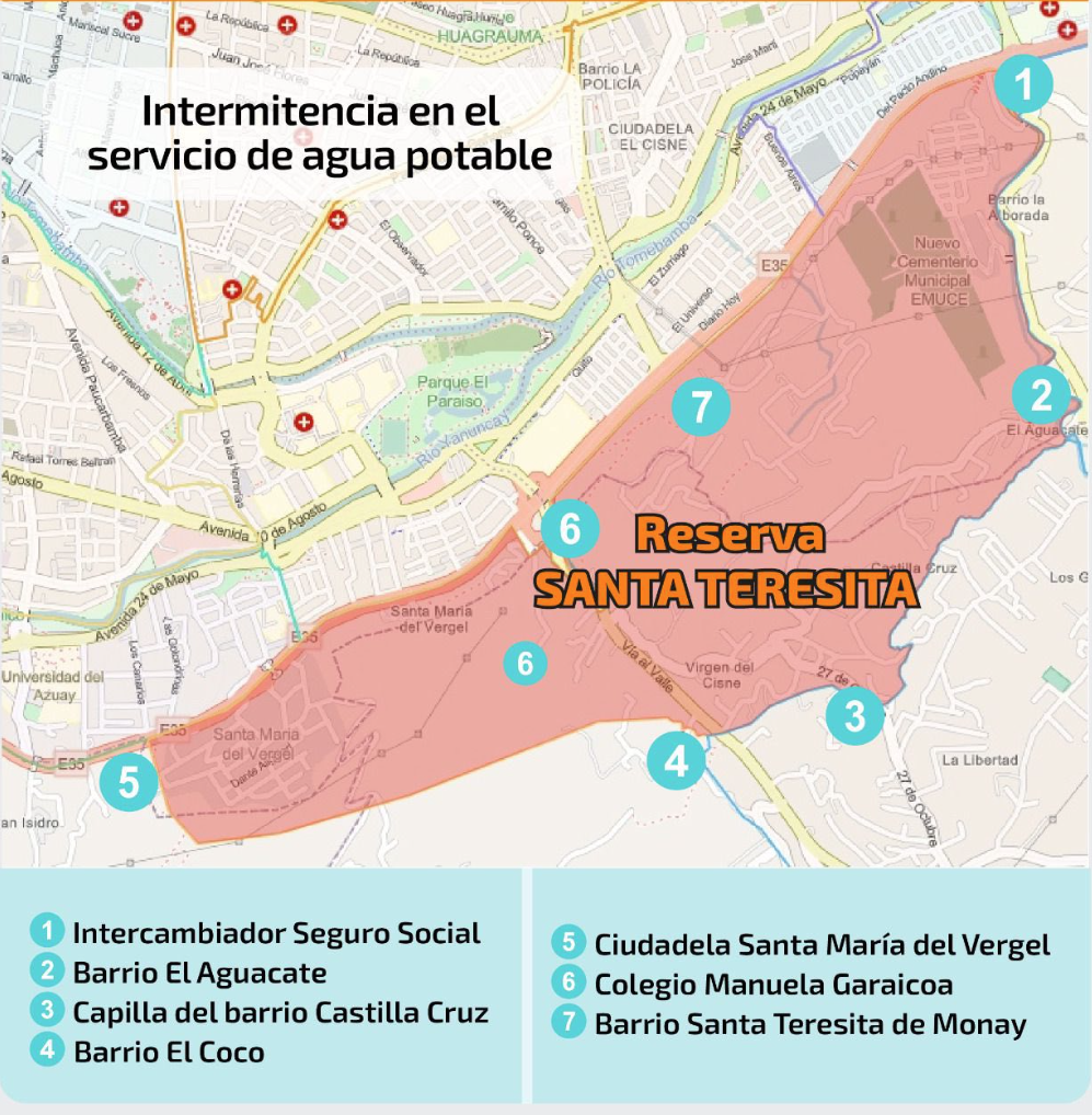 Debido a las obras, desde la Empresa de Telecomunicaciones de Agua Potable, Alcantarillado y Saneamiento (ETAPE EP), se indicó que las intermitencias en el servicio se presentarán en los sectores que dependen de las reservas de: